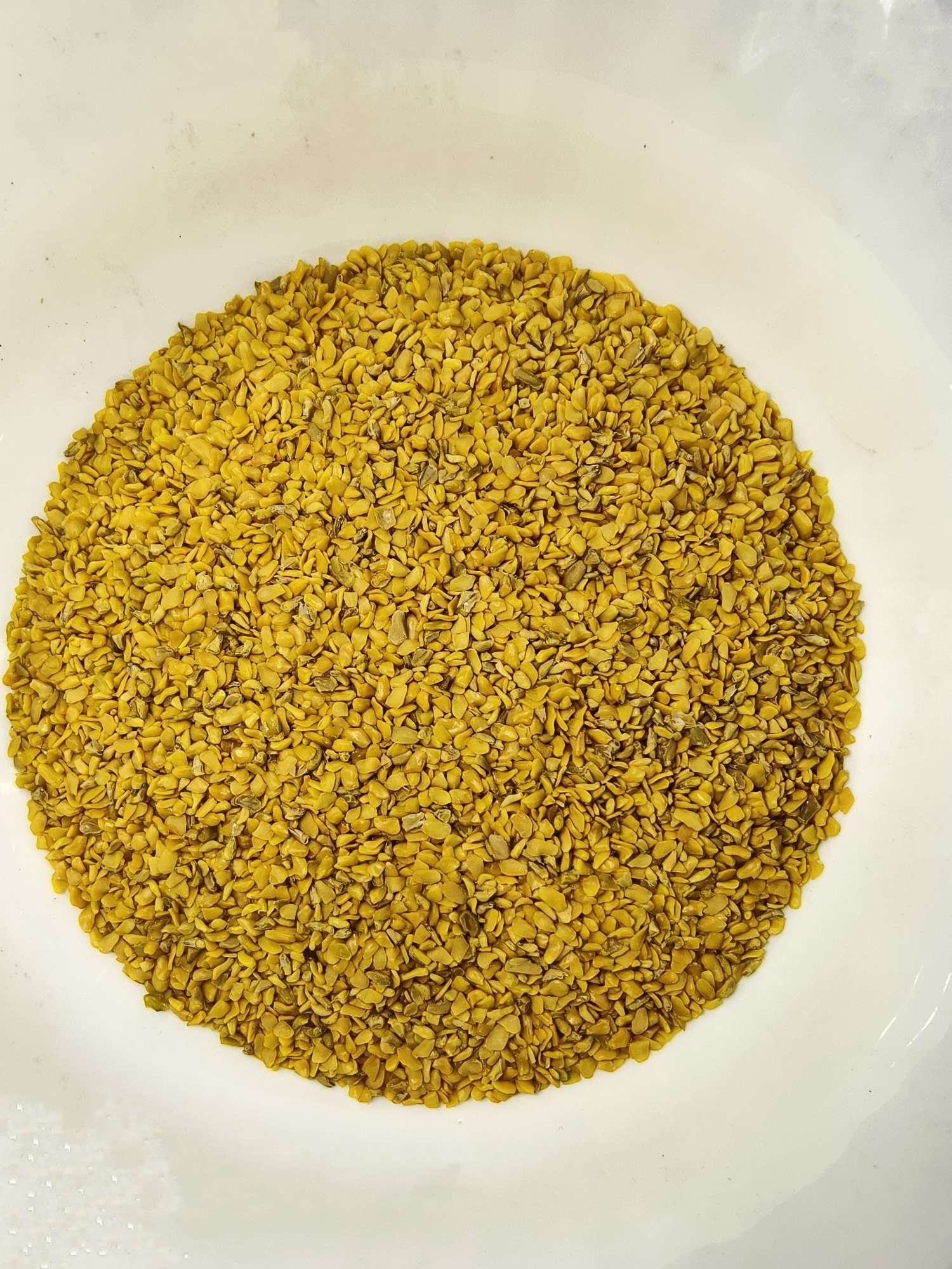 Methi Dal is produced by splitting whole raw Fenugreek seeds and mechanically removing the outer brown hull (husk). What remains is the pure, protein-rich endosperm—a bright yellow split seed.